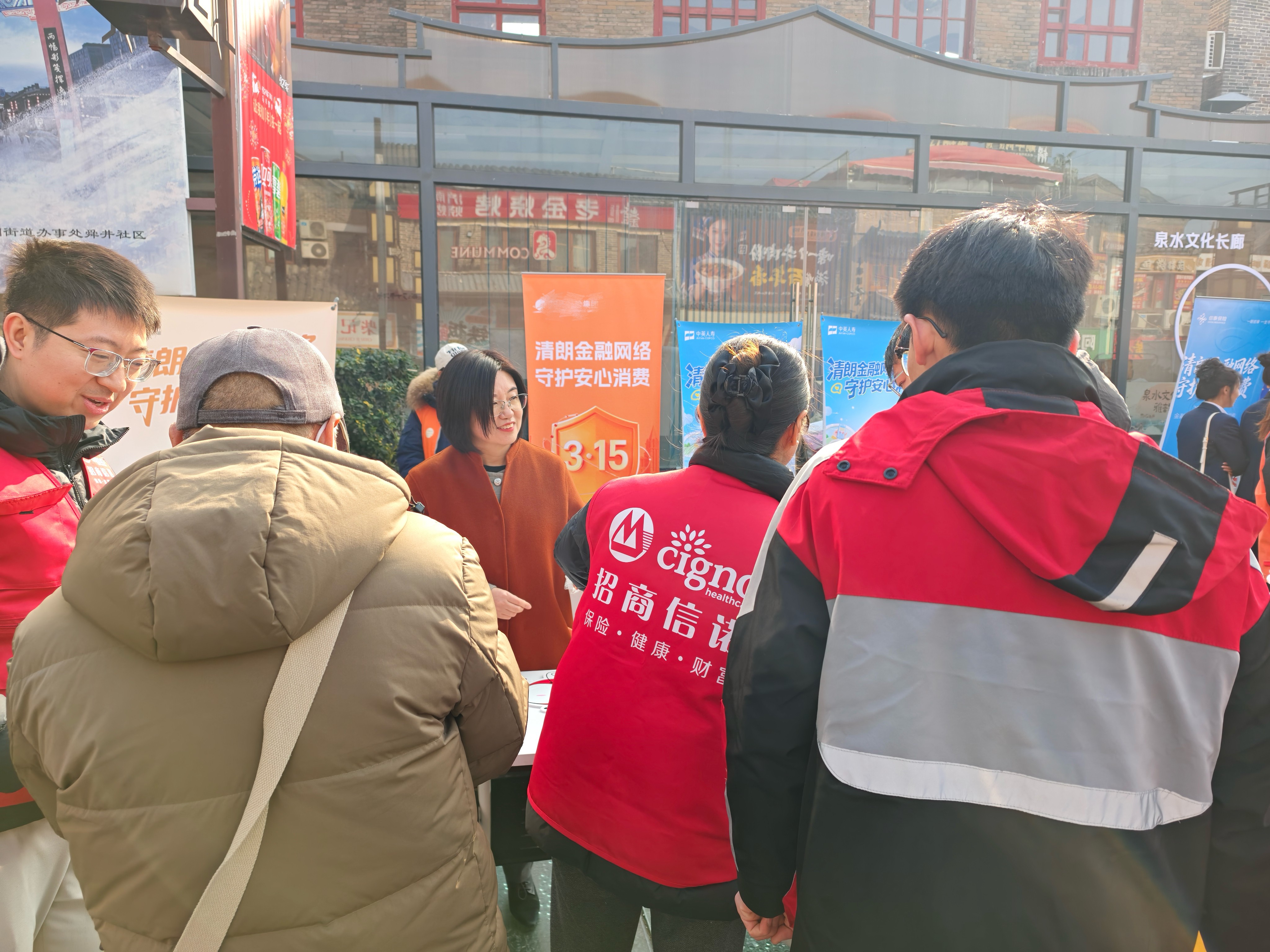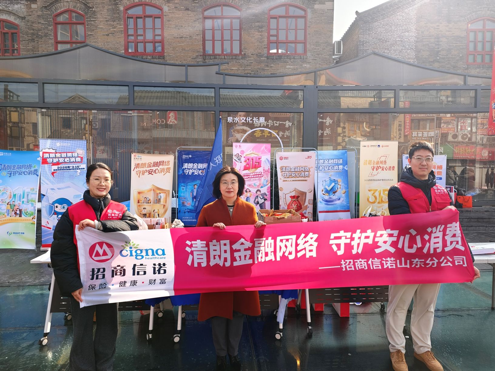 保险有限公司(简称“招商信诺”)山东分公司联合19家保险公司,携手济南广播电视台、大明湖街道舜井社区,在济南泉水文化长廊开展以“清朗金融网络 守护安心消费”为主题的金融消费者权益保护教育宣传活动,以多元形式将金融知识与消费维权服务送到群众身边。